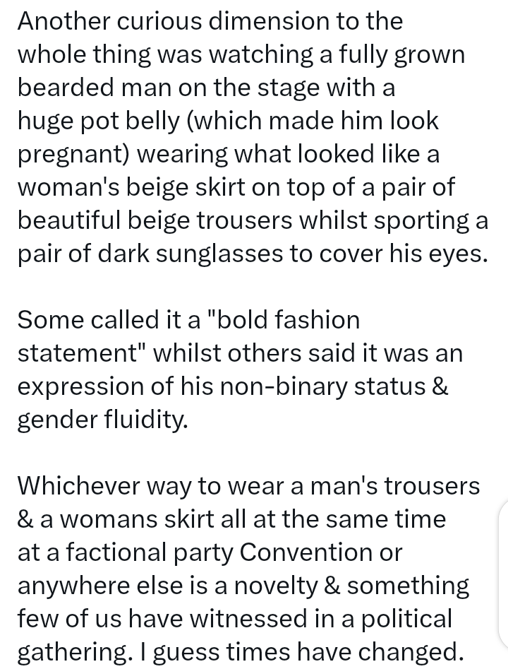 “Whichever way, to wear a man’s trousers and a woman’s skirt all at the same time at a factional party convention or anywhere else is a novelty and something few of us have witnessed in a political gathering”.