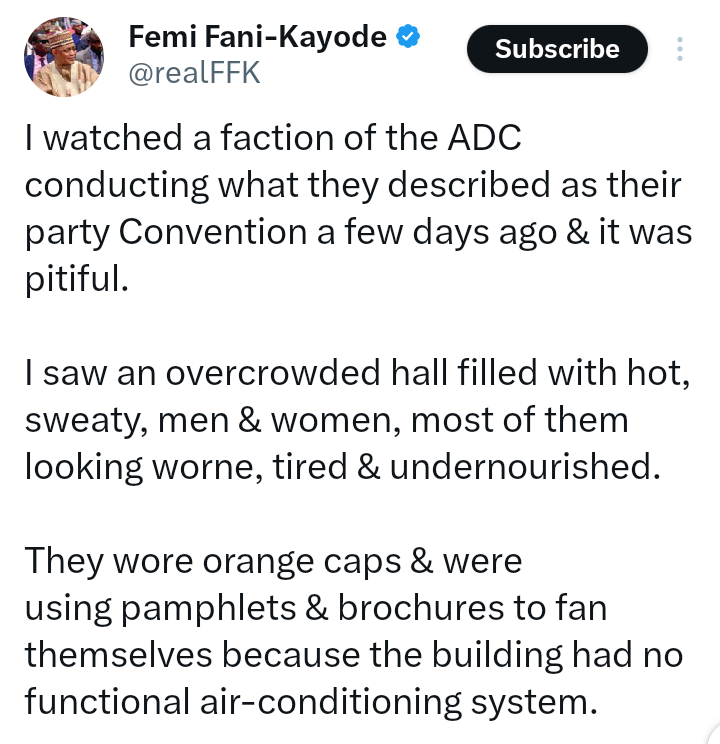 The former Minister of Aviation criticized the convention that was organized by leaders of the African Democratic Congress, ADC. Femi Fani-Kayode stated that those who attended the event looked tired and undernourished.