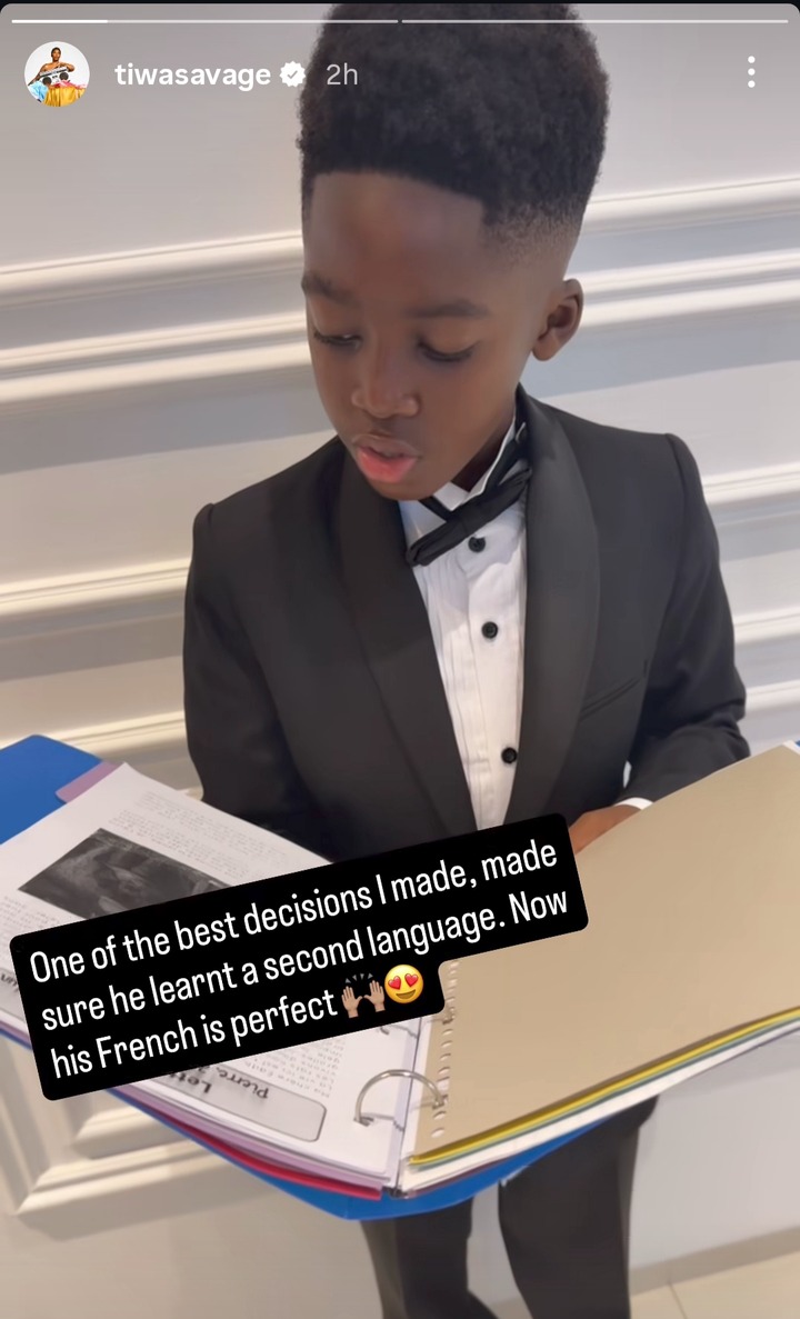 In her post, Tiwa expressed immense pride and fulfilment over one of her best parenting choices — teaching her son to master a second language. She wrote, “One of the best decisions I made was making sure he learnt a second language. Now his French is perfect.”